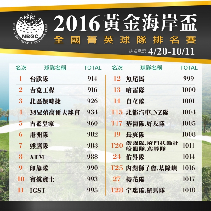 2016黃金海岸盃全國菁英球隊成績排名賽04/20~10/11排名戰況